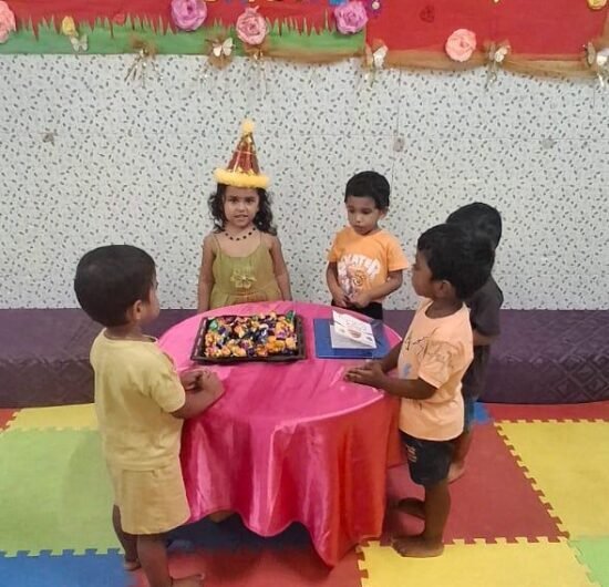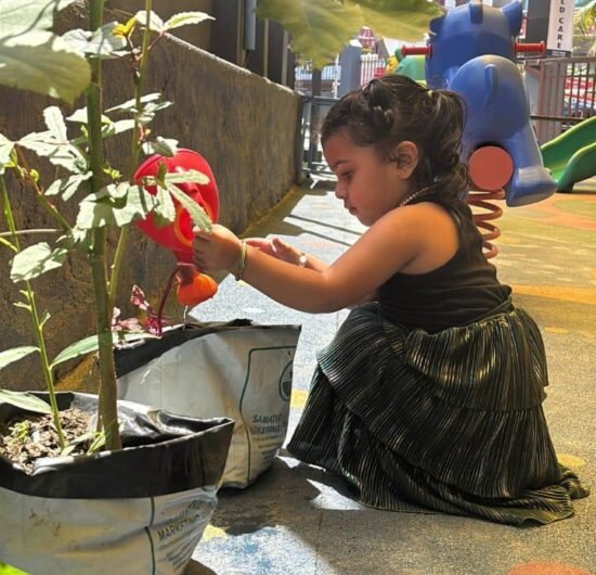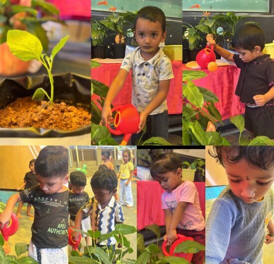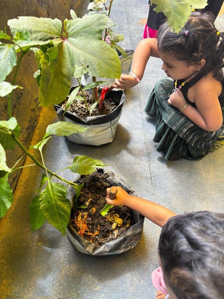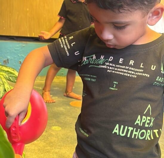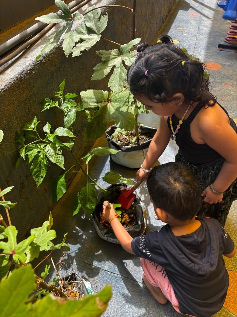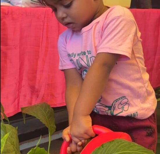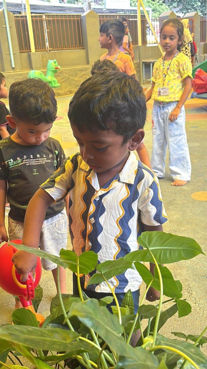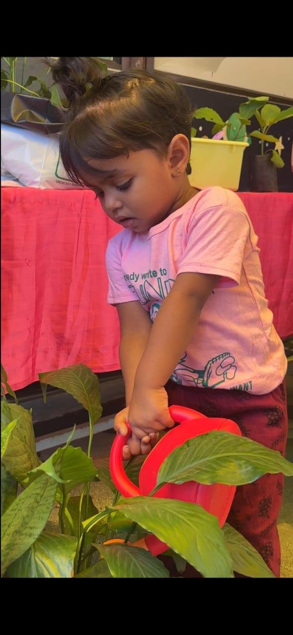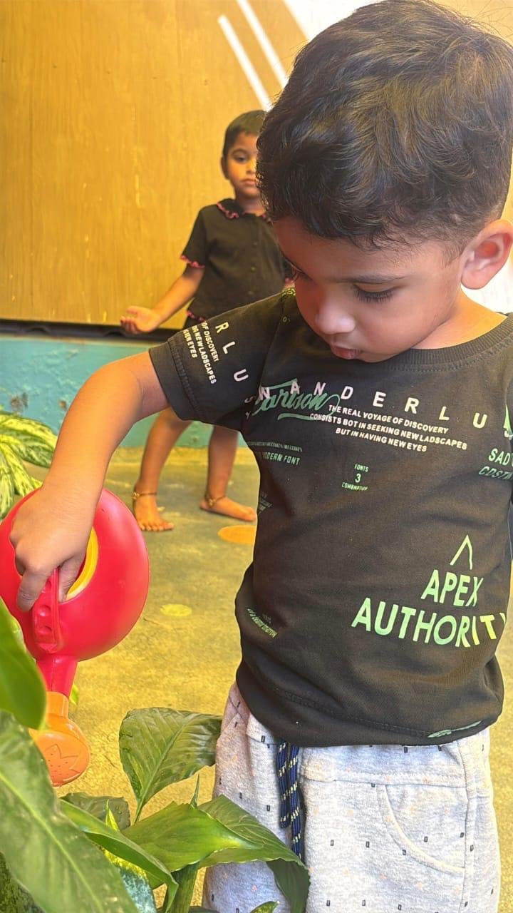 Children explore and learn through sensory-rich activities such as sand play, block play, gardening, and creative art, all of which help strengthen fine and gross motor skills. Early language development is supported through age-appropriate phonics, songs, and rhymes that build listening and communication skills. We also provide gentle guidance in personal care routines, including potty training, with patience and positive reinforcement.